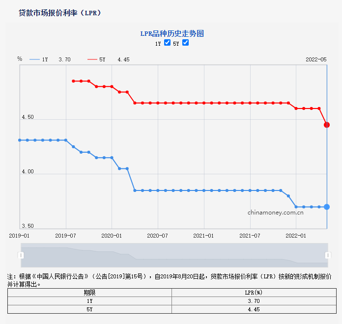 5月20日,央行授权全国银行间同业拆借中心公布,5年期LPR由4.6%下调15个基点至4.45%。