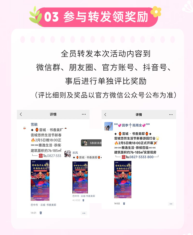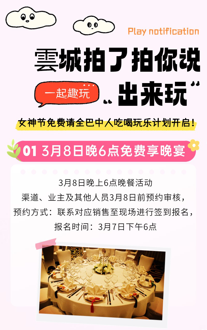 其次巴中之窗及网红到访云城发送抖音及朋友圈,每人赠送500元餐券一张,用于餐厅及2楼棋牌室使用。活动期间,所有到访云城人员及团队至餐厅及2楼棋牌室消费(含使用餐券),享受8折优惠,详情咨询售楼部。