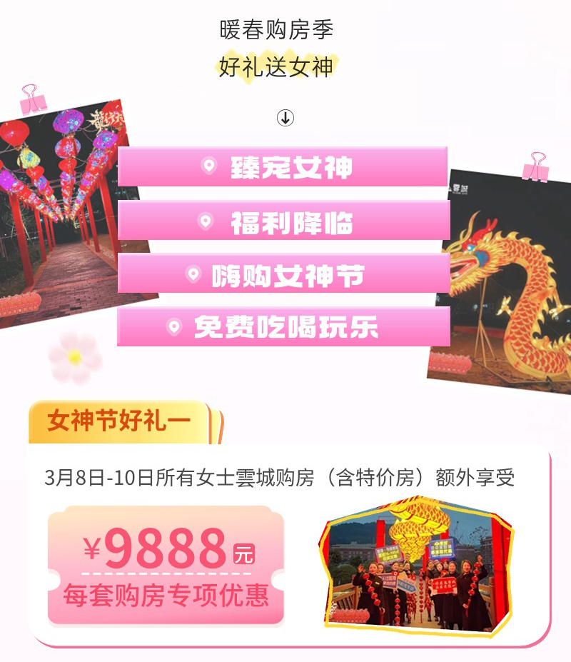 暖春购房季,好礼送女神,活动期间购买云城最高可享9888元/套的额外优惠,认购即赠送55寸电视一台(仅限10套)+电饭煲一台,洗衣机(首访成交),先到先得,送完即止。