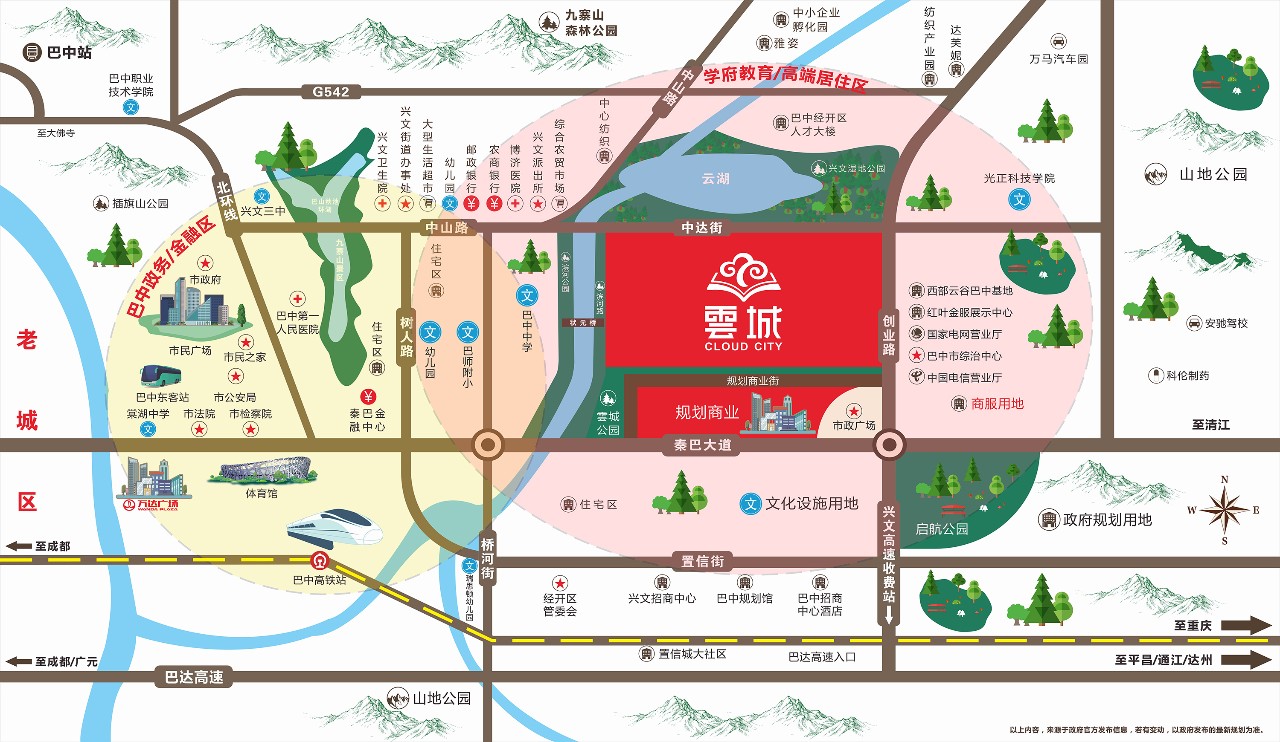 雲城·书香美邸占地面积约135亩,一河一湖三公园环绕;近邻巴中中学、巴师附小;兴文高速出入口,高铁东站。
